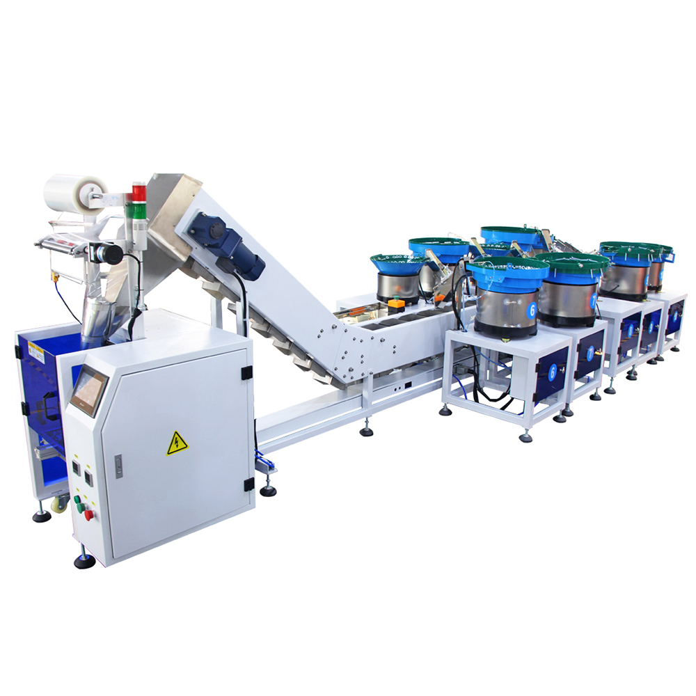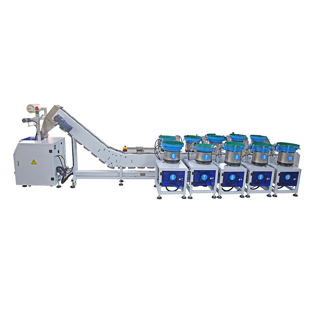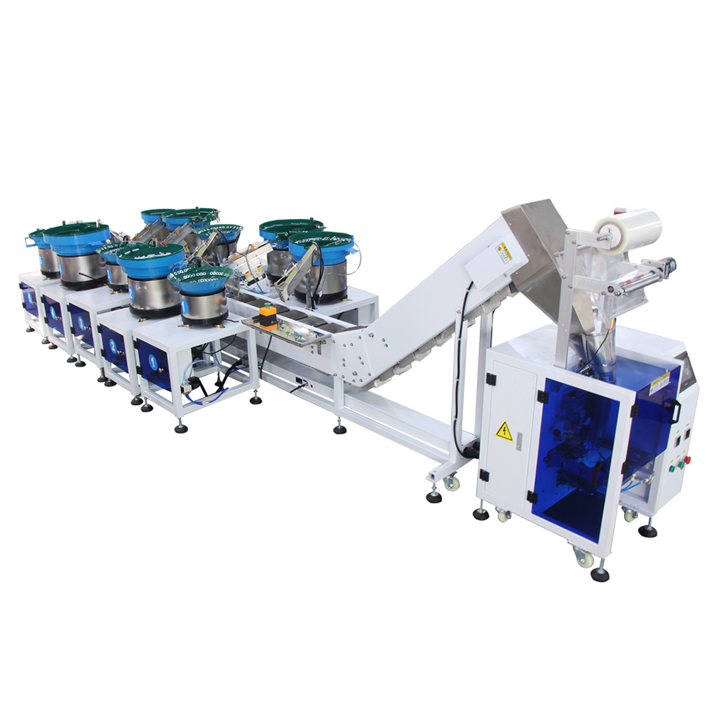 This product is suitable for automatic mixing or individual packaging of less than seven materials, such as screws, nuts, flat washers, spring washers, toys, standard parts, etc. This product uses a chain bucket to drive the material box to rotate, and the vibrator bowl automatically counts materials put the product into the material box, the chain bucket fills the product into the automatic packaging of the forming machine. This product adopts a corner method to reduce the height of the trailer, which is convenient for manual putting, and it can also use the spare space of the equipment to manually put other materials in mixed packaging.