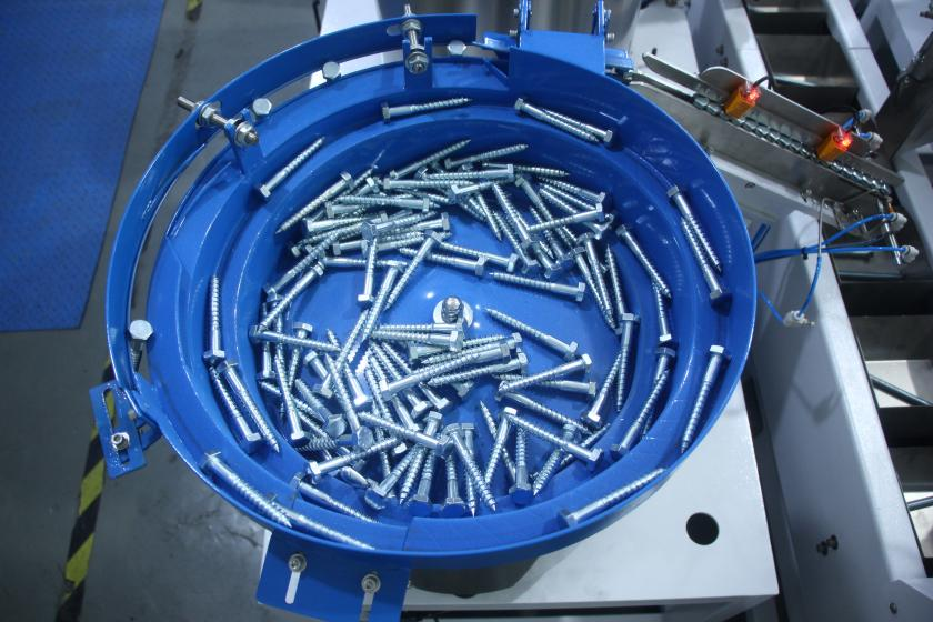 This is an 8-tray automatic packaging machine for packaging screws, flat pads and other parts. The material is fed and counted through the vibrating plate, transported to the former, and then bagged.